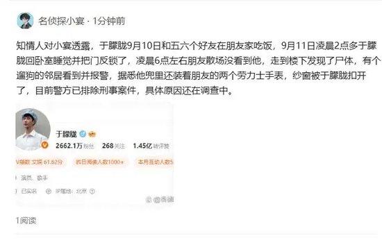 娱记名侦探小宴发文称:于朦胧是在9月10日这天和几位好友在家中吃饭。11日凌晨2点多,于朦胧回卧室睡觉并把门反锁了,凌晨6点左右朋友散场却没有看见他,走到楼下才发现了尸体。是一位遛狗的邻居看到并报警,此时他兜里还装着朋友的两个劳力士手表。知情人称纱窗被于朦胧叩开,目前警方已经排除刑事案件,具体原因还在调查。