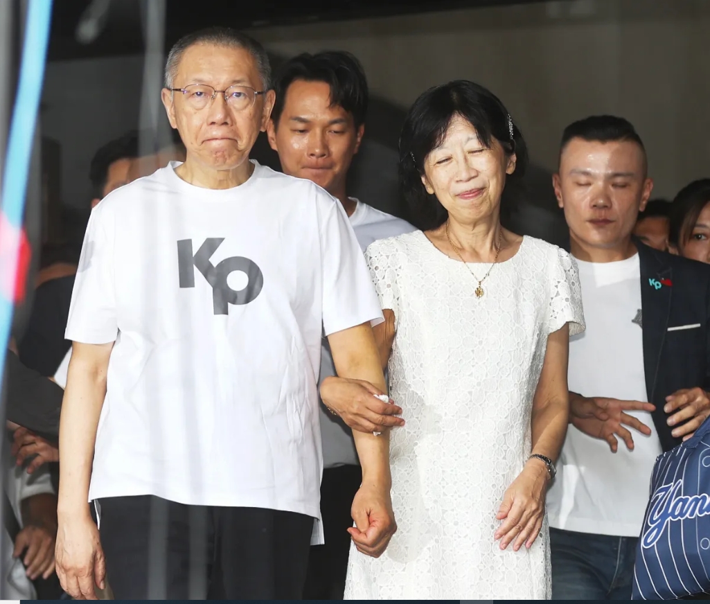 民眾黨前主席柯文哲(左一)今日在北院辦理交保後,裝上科技腳鐐完備程序後,在妻子陳佩琪(右二)陪同下離開法院。圖/陳正興
