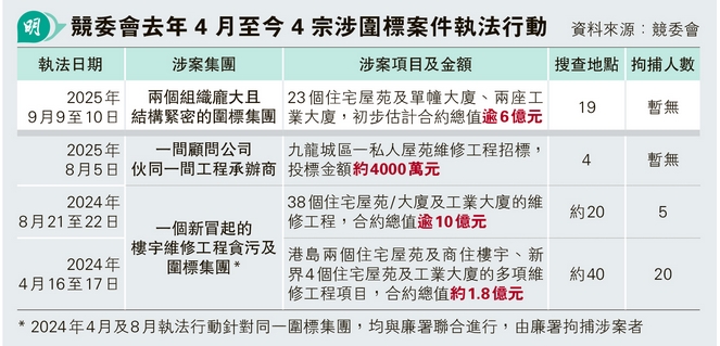 競委會表示,一直高度關注涉及樓宇維修的圍標行為,並主動追查相關個案,包括上月就九龍城區某屋苑維修工程涉圍標案件搜查,去年亦兩度與廉署聯合行動,搗破一個新冒起違法集團(見表),形容3次行動不但大力推進原本的調查,經深入分析所得資料後更發現案中有案,陸續揭發更多違法集團滲入多區樓宇維修工程,從事圍標等反競爭行為。