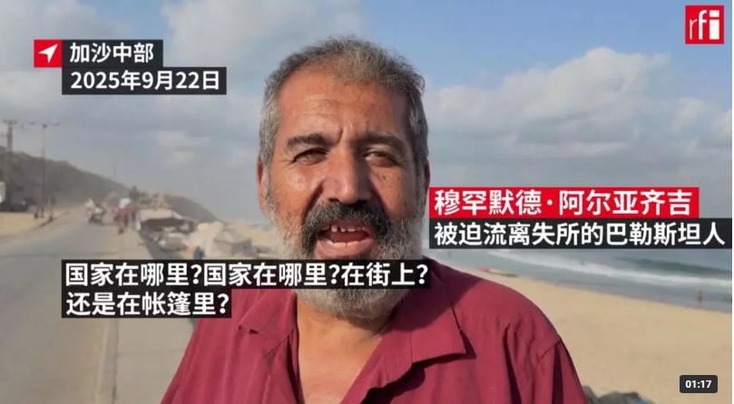 另一位流离失所的加沙巴勒斯坦人穆罕默德·阿尔亚齐吉对此消息反应得更为怀疑。他略微激动地反问道:“(巴勒斯坦)国家在哪里?在哪里?在街上吗?还是在帐篷里?”他一边在加沙中部沿海公路上走着,一边对路透社记者说:“一切交给主,主是我们的依靠,也是我们事务的最佳管理者。我只能说这么多”。